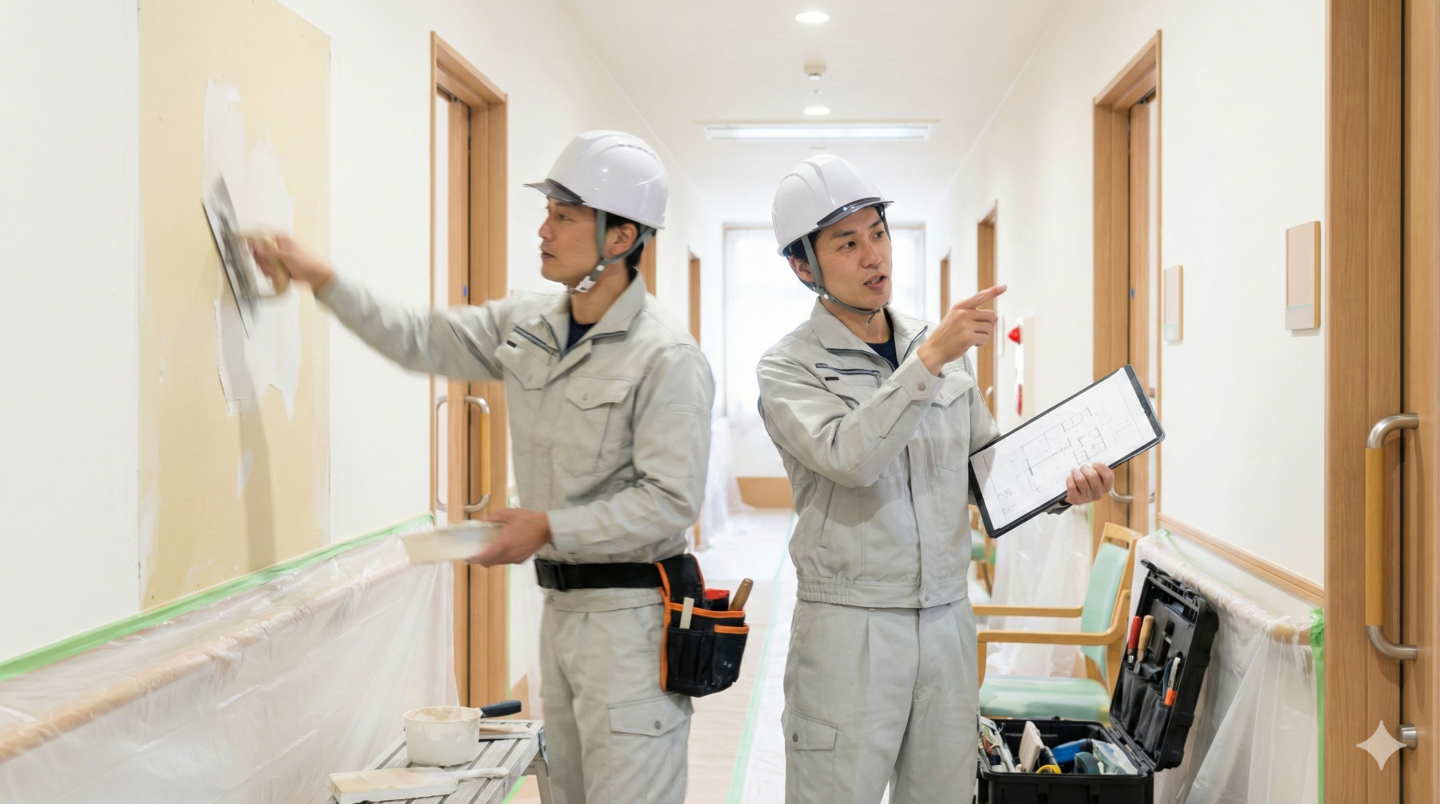 今回の工事は、施設を利用される皆様がより安全で快適にお過ごしいただけるよう、ドアの不具合解消および壁面破損箇所の補修を行うものです。