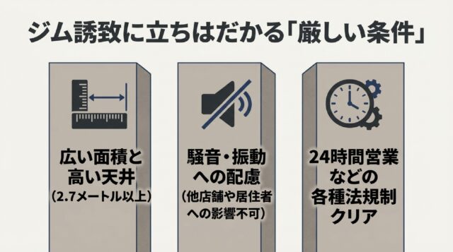 今回、2階のテナントとして誘致を想定しているフィットネスジム様の物件募集条件は、実はかなり専門的でハードルが高いんです。