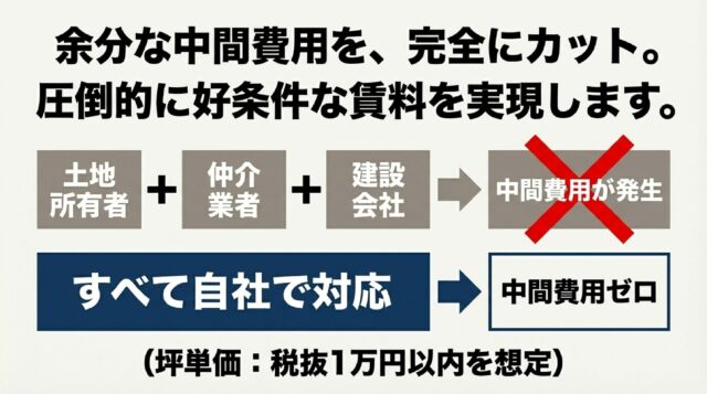 | 自社設計・施工 | 中間マージンを削減し、テナント様へ「坪単価1万円以内」という魅力的な賃料条件を提示可能。 |