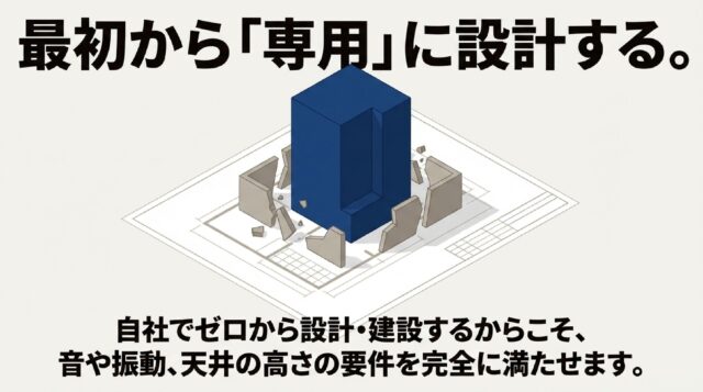 既存の中古物件でこれら全てを満たすハコを探すのは至難の業ですが、弊社ならゼロからオーダーメイドで設計できるため、音や振動に配慮した強固な構造や、2.7m以上の高い天井高も最初からプランに組み込むことができます。