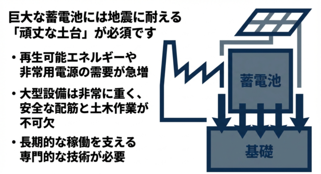 大型の蓄電池を安全かつ長期的に稼働させるためには、その多大な重量をしっかりと支え、地震などの自然災害にも耐えうる頑丈な「基礎」が不可欠です。