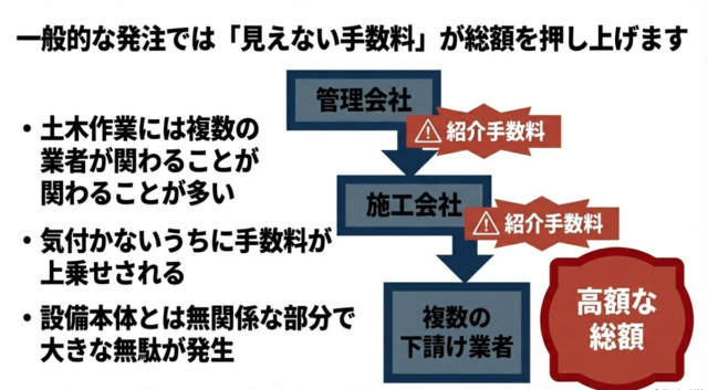 一般的に、こうした専門的な土木工事は複数の下請け業者や管理会社を経由することが多く、気付かないうちに紹介手数料などの中間マージンが上乗せされ、見積もりが大きく膨れ上がってしまう傾向にあります。ここがコストを抑えたいオーナー様にとっての悩みどころかなと思います。