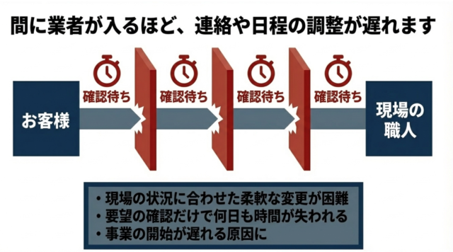 複数の業者が間に入っていると、「現場の状況に合わせて少し仕様を変更したい」「できるだけ早く着工してほしい」といったご要望があっても、確認や調整だけで何日もタイムロスが発生してしまいます。