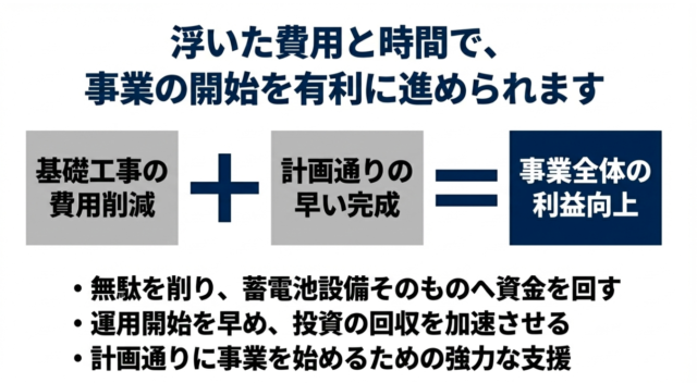 コスト面 中間マージンのカットにより、基礎工事費用を大幅に抑制。浮いた予算を設備のアップグレードや他の運用資金に充てられます。