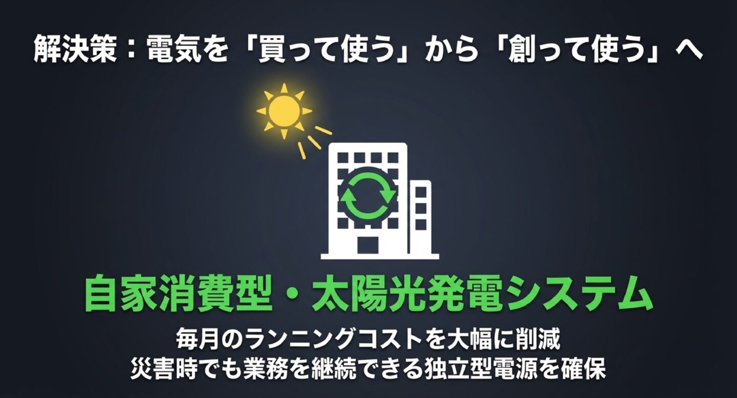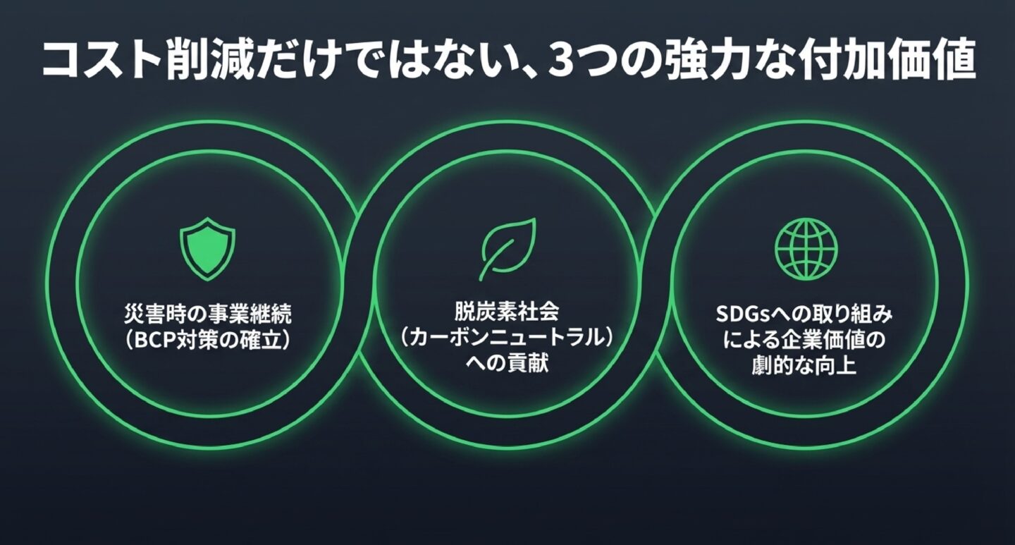 新築事務所ビルへの自家消費型太陽光発電の導入は、単なる「コスト削減」にとどまりません。