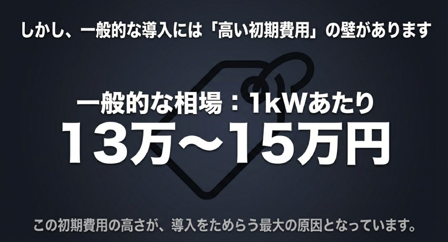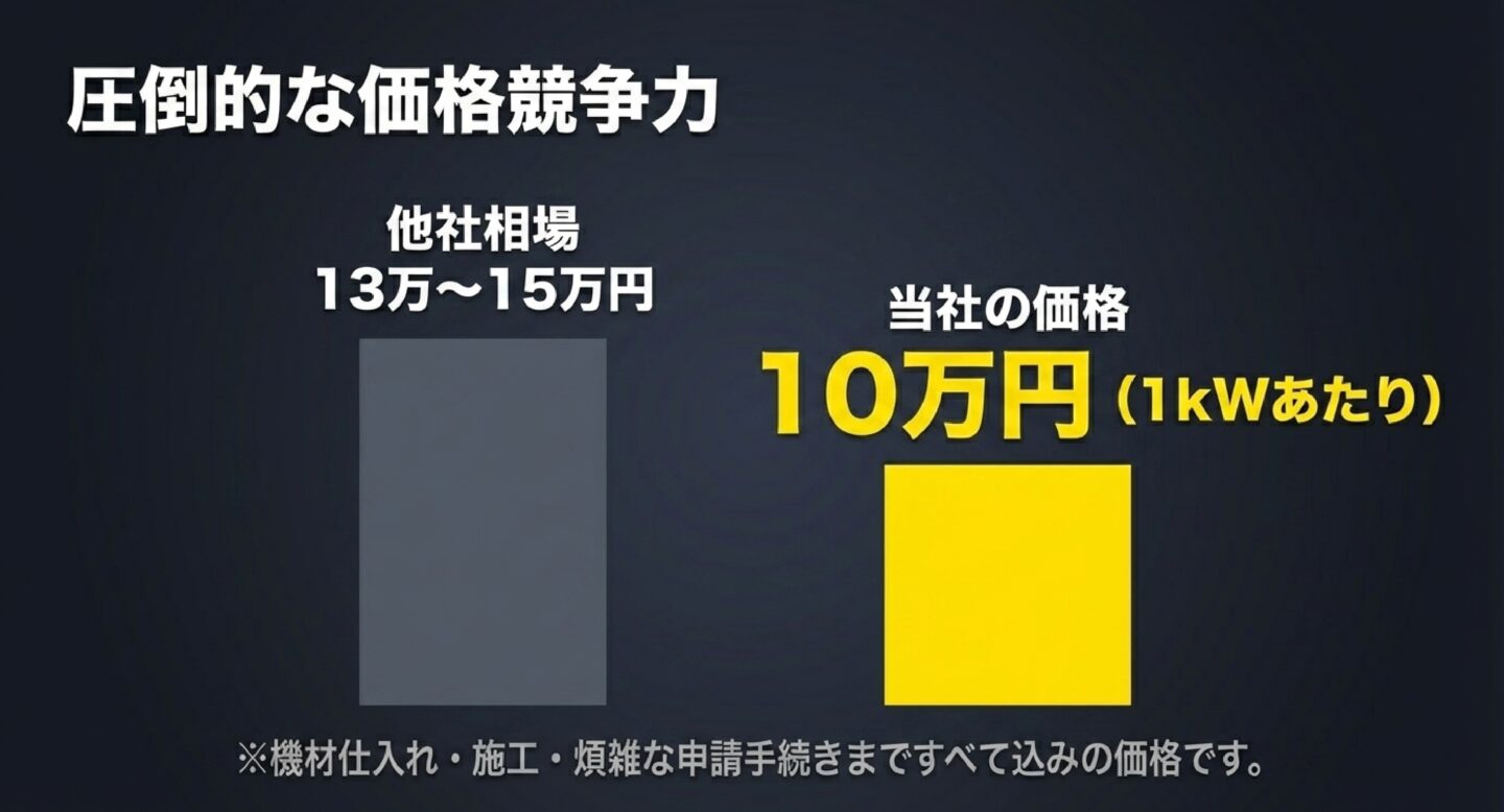 しかし弊社では、この単価を「1kWあたり10万円」でご提供することが可能です。