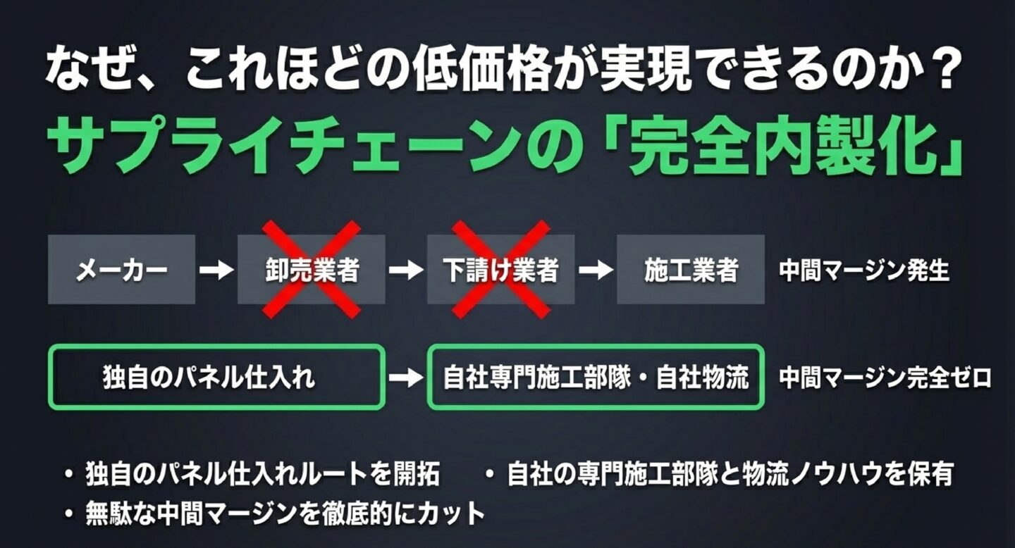 それは、弊社が太陽光パネルの独自仕入れルートを開拓し、自社の施工部隊と独自の物流ノウハウを完全に保有しているからです。