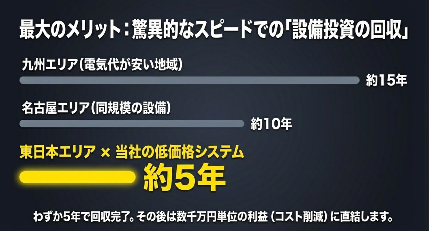 しかし、弊社のシステムを電気料金水準の高い東日本エリア(今回の埼玉県など)に導入し、さらに1kWあたり10万円という圧倒的な低コストで設置した場合、なんと「約5年」という驚異的なスピードで設備投資を回収することが可能となります。